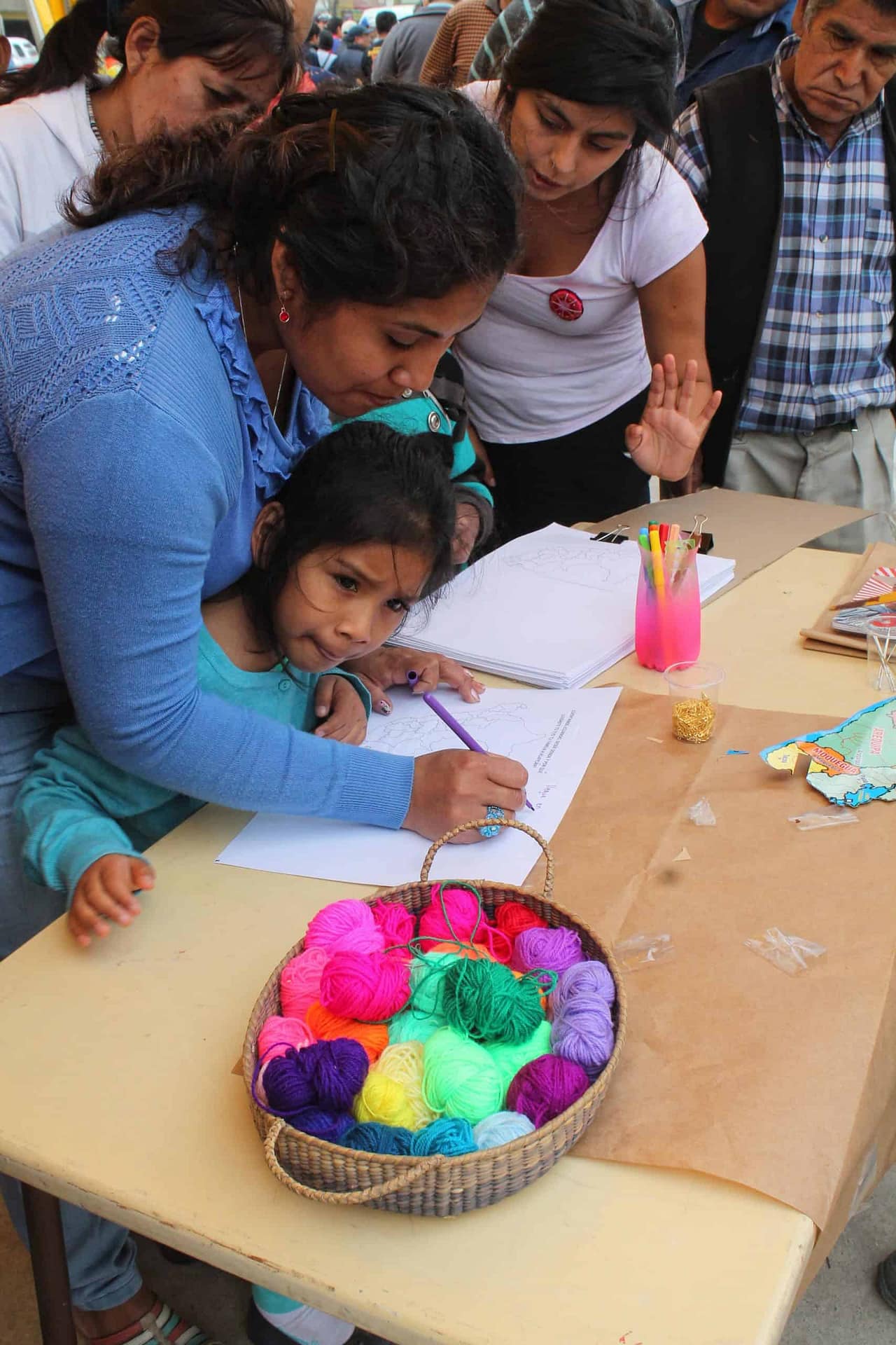 La dinámica se basa en instalarnos en un lugar público específico, donde haya tránsito de personas, con un mapa de América, hilos de colores y un gran cuaderno. Se les invita a bordar con una lana la ruta que ha recorrido su familia (padre, madre, abuelos/as) para llegar al lugar donde hoy en día vive la persona. Mientras lo hace, se van haciendo preguntas que despierten la memoria familiar de cada participante ¿cómo era tu país en ese momento? ¿por qué tu familia migró? Luego se les pide que escriban una pequeña anécdota familiar que les hayan contado o hayan vivido en ese recorrido.