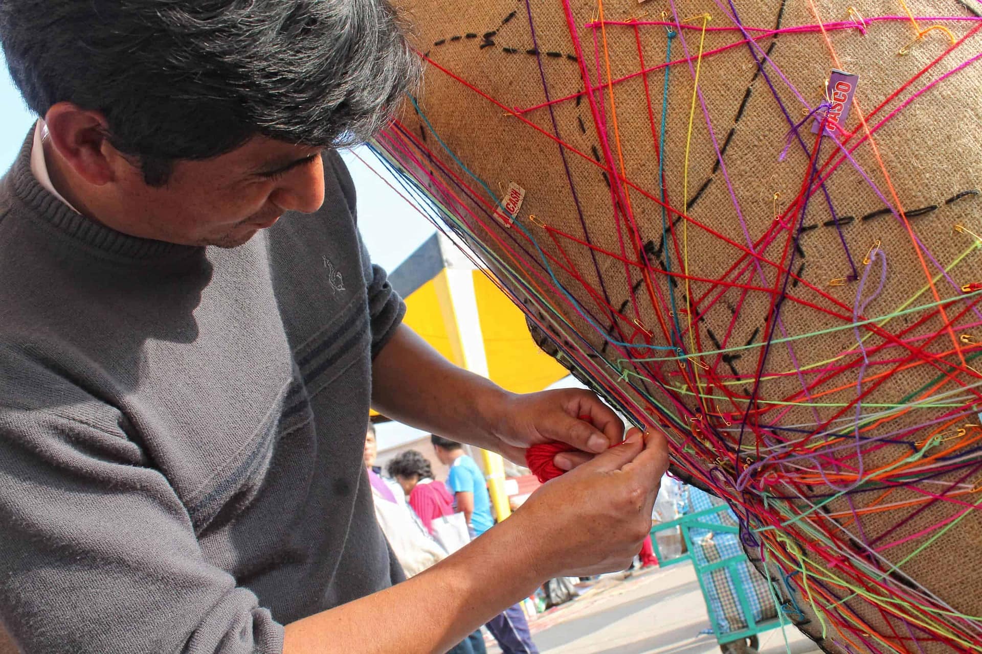 La primera intervención que realizamos fue en 2015, en el marco de la FESTIFERIA memoria, arte y reflexión en la Plaza de Armas de Huaycán, distrito limeño creado por el desplazamiento forzado de familias durante el conflicto armado interno en el Perú (1980-2000). En esta primera ocasión fueron aflorando los recuerdos de cómo llegaron a Lima, mientras bordaban los caminos recorridos. Así comenzó el diálogo y el encuentro de diversas generaciones contando el porqué, cuándo y cómo llegaron a Lima. Varias historias se fueron bordando, entre risas, sorpresas, nostalgia y alegrías.